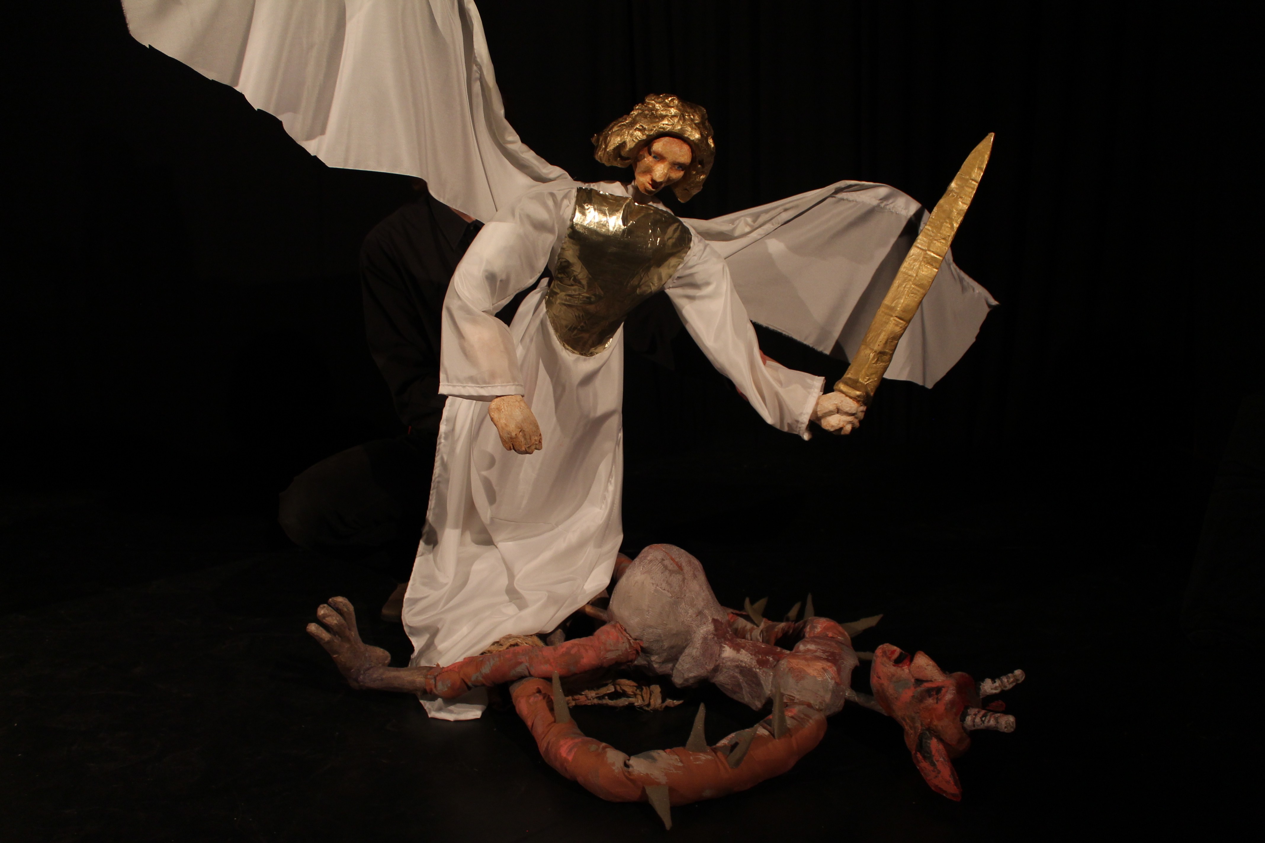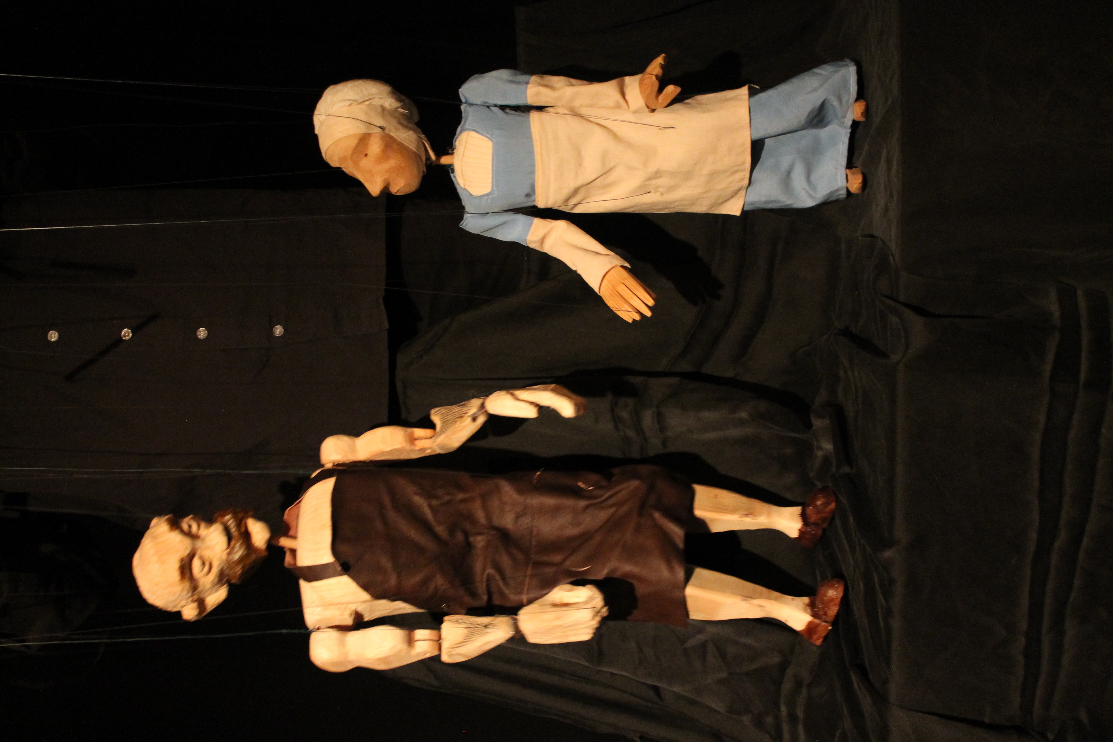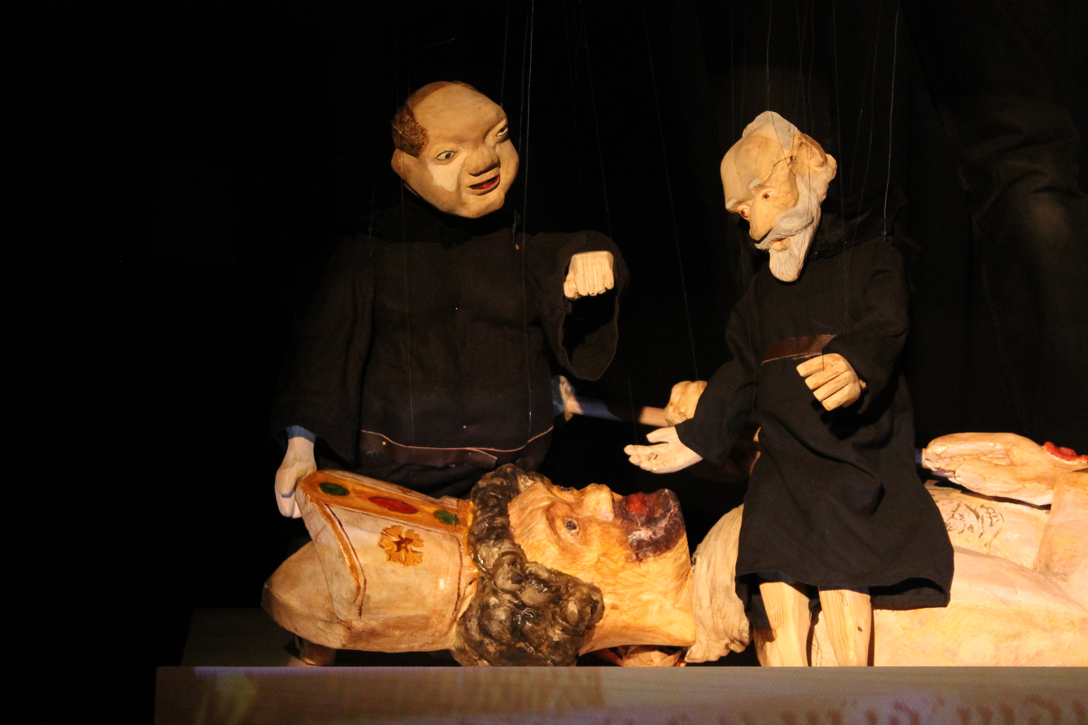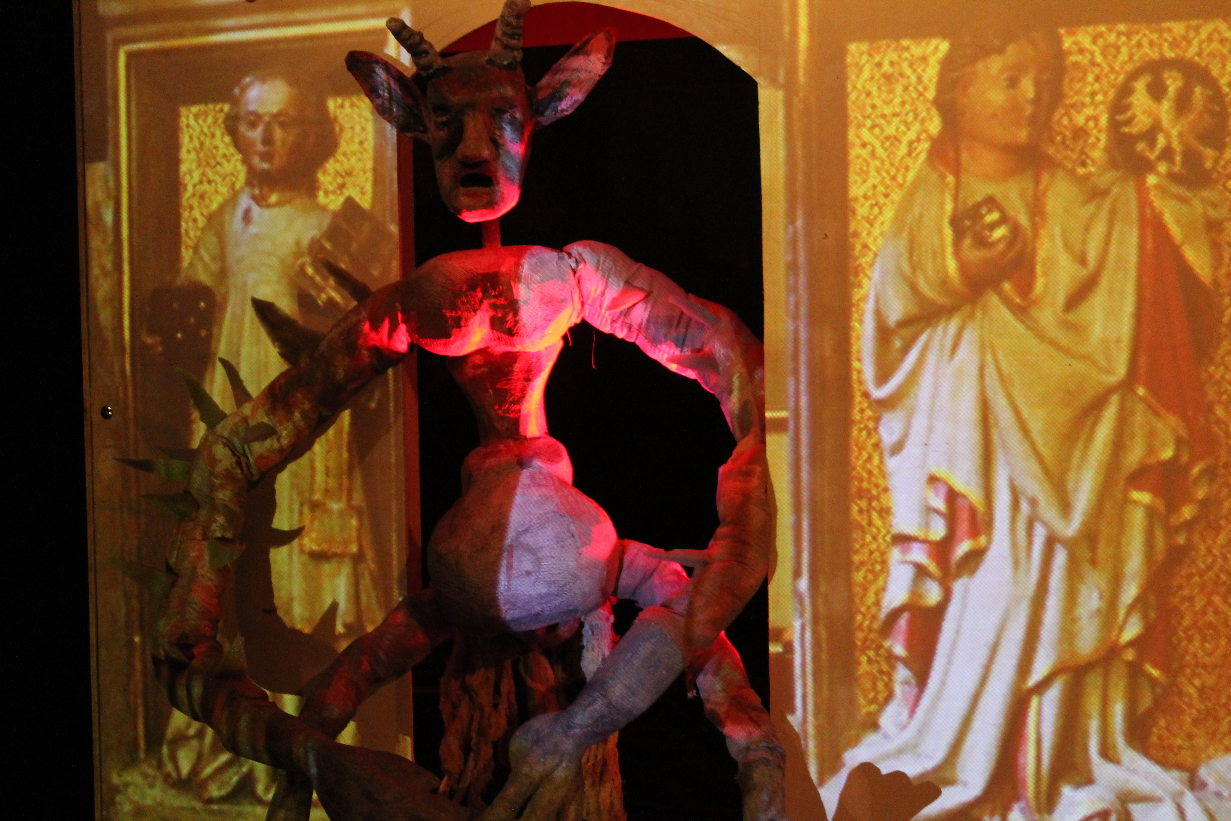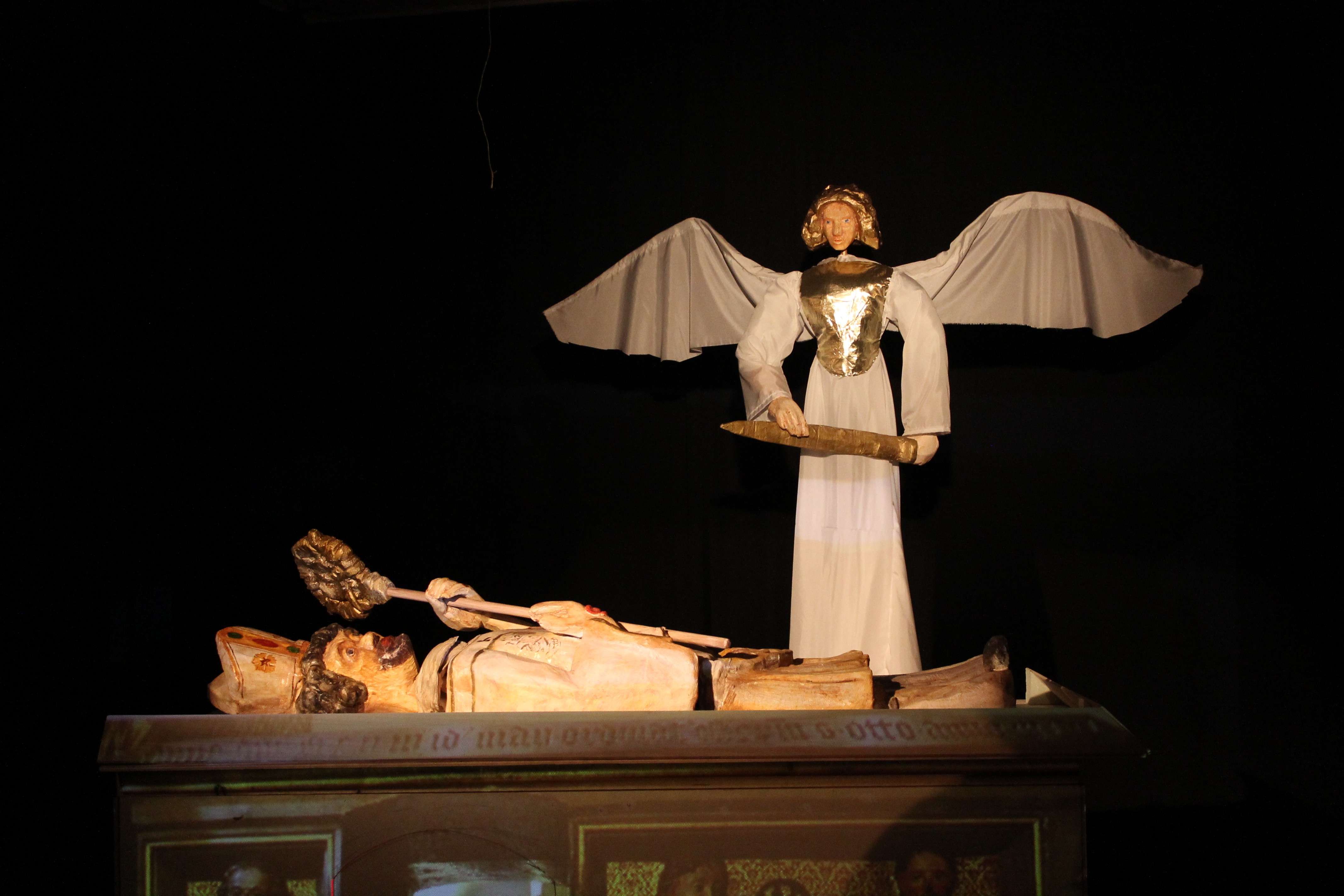 Der in Prag geborene Künstler Jan Zabletal schuf für dieses Stück rustikal geschnitzte Marionetten und wunderbare Großfiguren, bei denen er sich teilweise an den Kunstwerken in der Klosterkirche orientierte. Auch die Traumsequenzen stammen aus seiner Trickfilmkiste.
