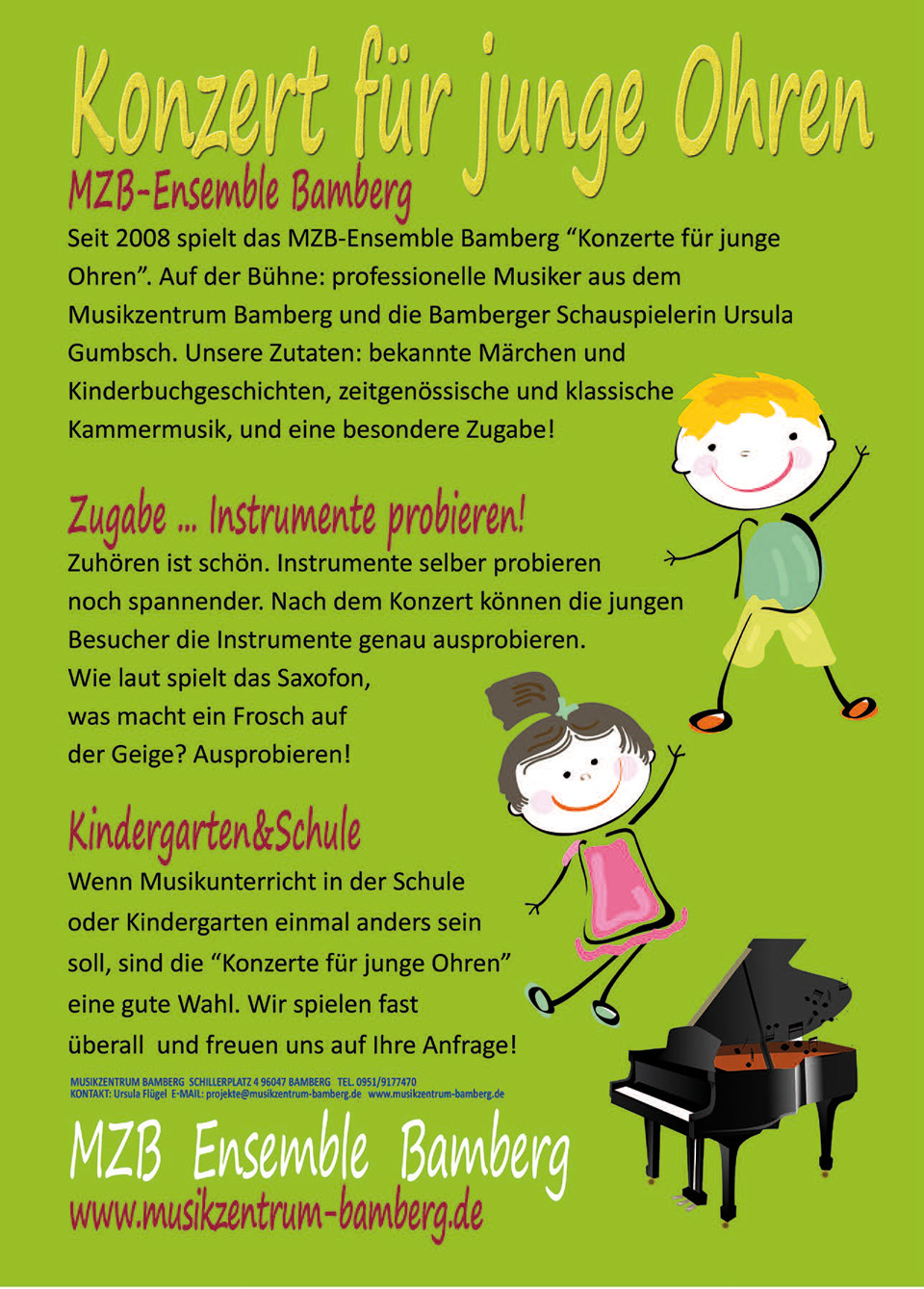 Auf der Bühne professionelle Musiker*innen aus dem Musikznetrum Bamberg gemeinsam mit der Bamberger Schauspielerin Ursula Gumbsch. Zu hören und zu sehen gibt es : Kinderbuchgeschichten, Märchen und moderne oder klassische Kammermusik. Es gibt Konzerte mit Fokus auf eine bestimmte Instrumentenfamilie, Konzerte zum Thema Jahreszeiten, … oder ein Konzert nach Ihren Ideen?!