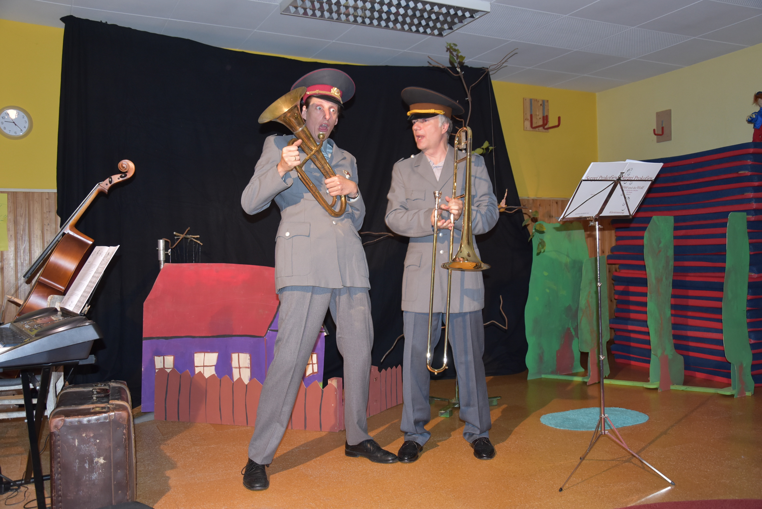 Nun beginnt eine fröhliche Gratwanderung zwischen panischem Aktionismus und genialer Improvisation mit den vorhandenen unzureichenden Instrumenten und Möglichkeiten. Schließlich gelingt die Planerfüllung: Die Instrumente des Orchesters werden vorgestellt und das Werk musikalisch sowie mit Puppentheater erfolgreich zur Aufführung gebracht.