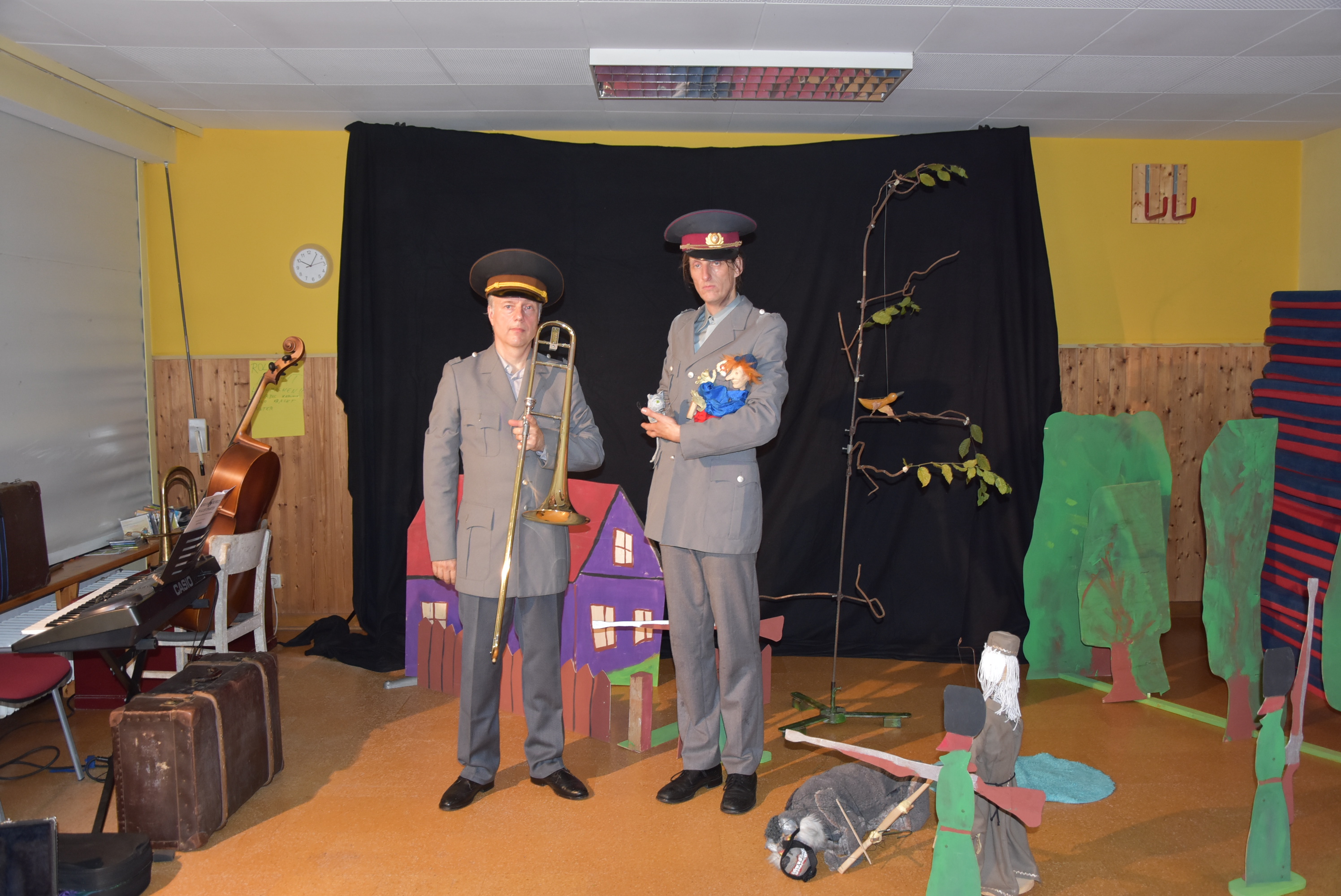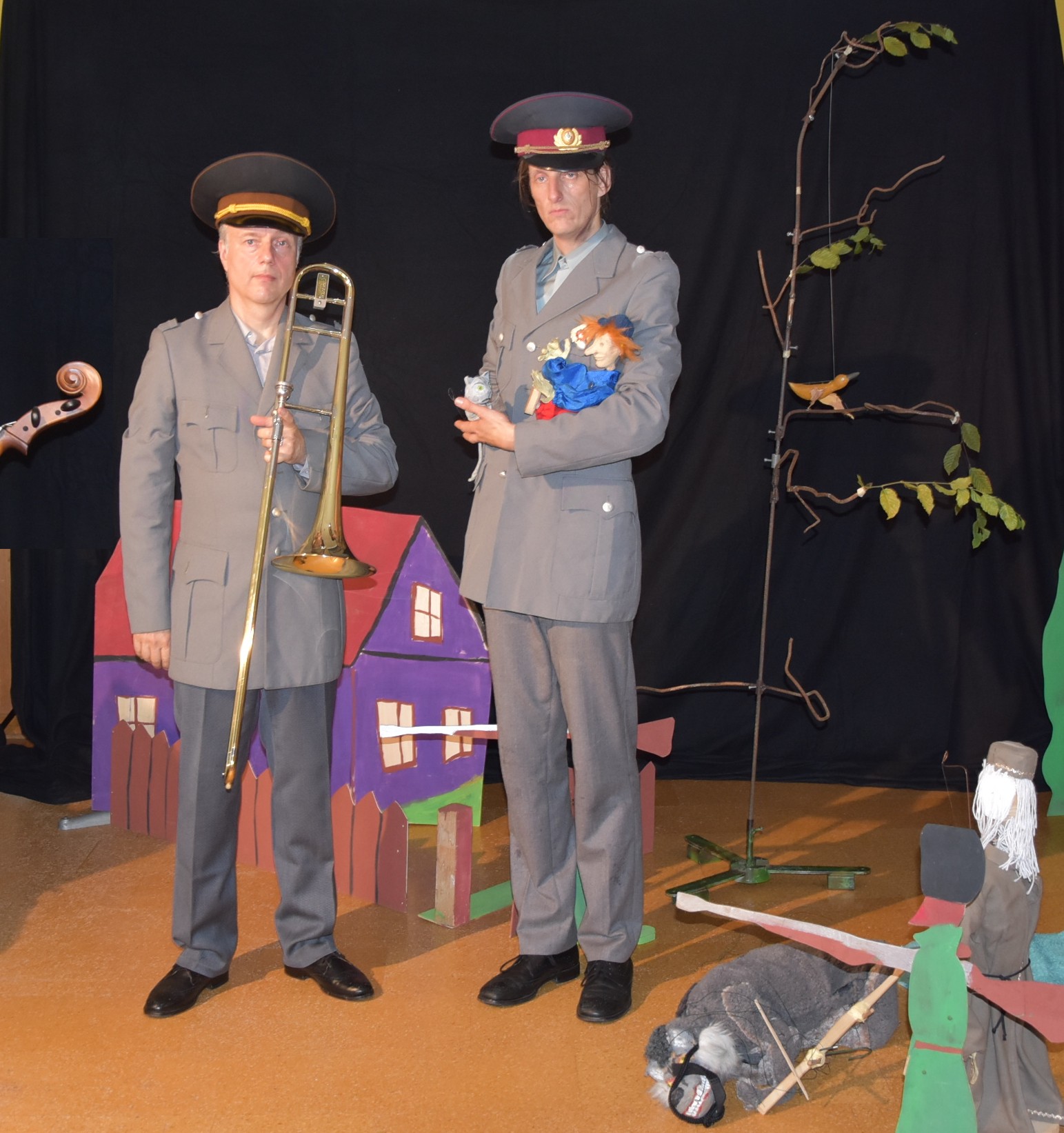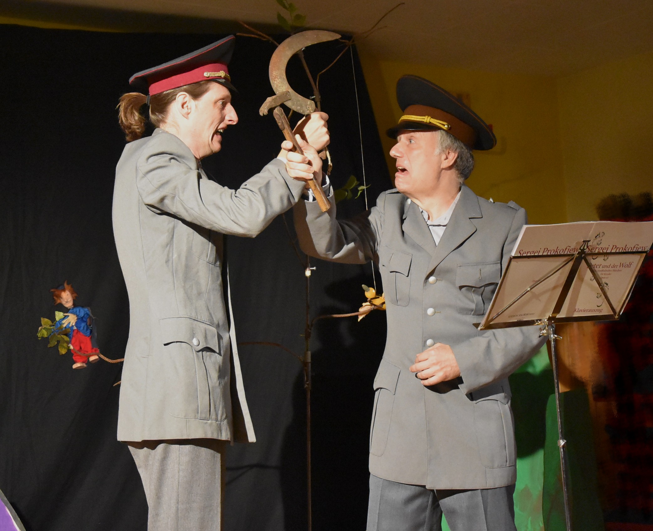 Inspiriert von der Biographie Prokofjews schufen wir eine Fassung für zwei Spieler (Franz Tröger und Patrik Lumma), in der zwei konkurrierende „offizielle“ Abgesandte zweier sowjetischer Ministerien das neue Werk des Genossen Prokovjew den Kindern präsentieren sollen.