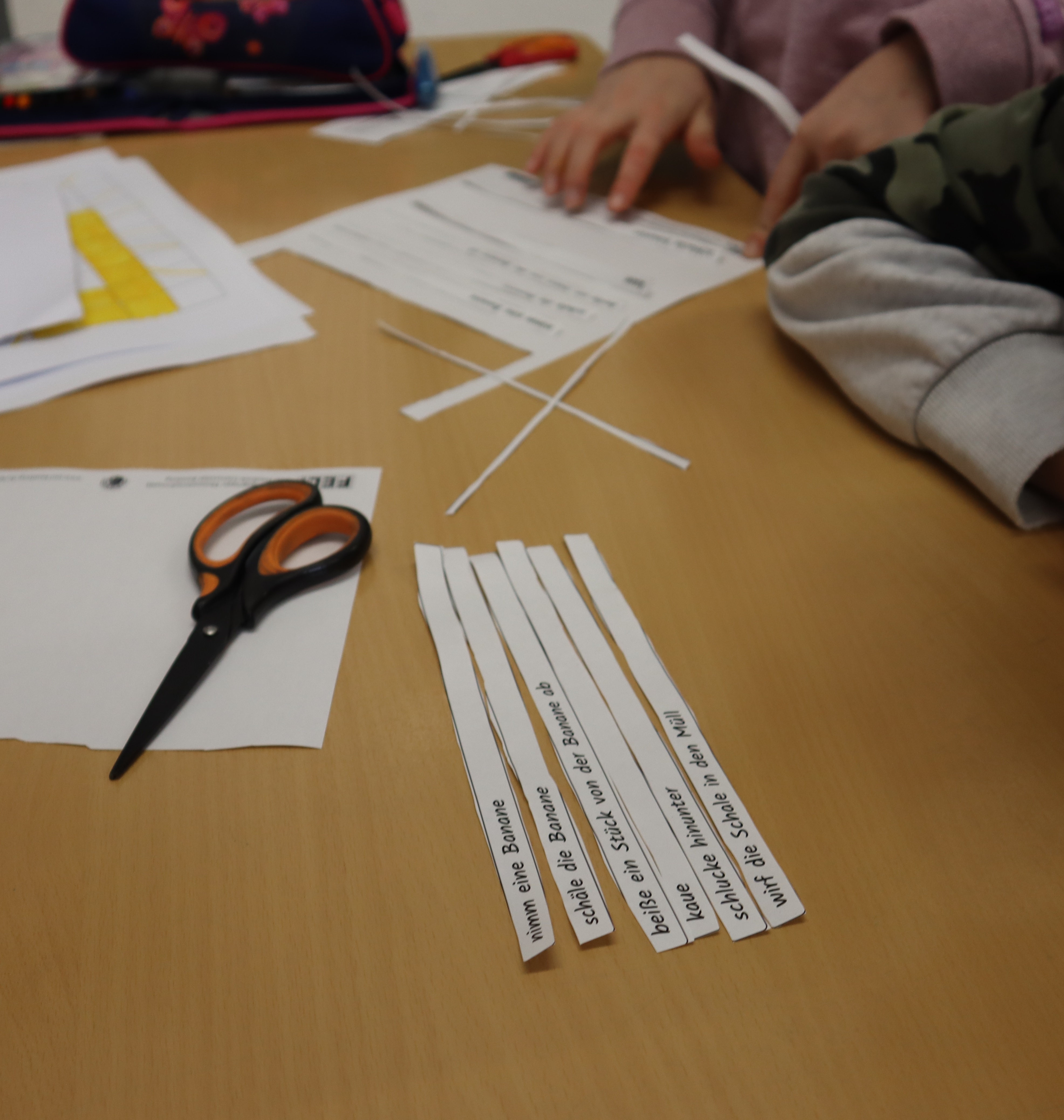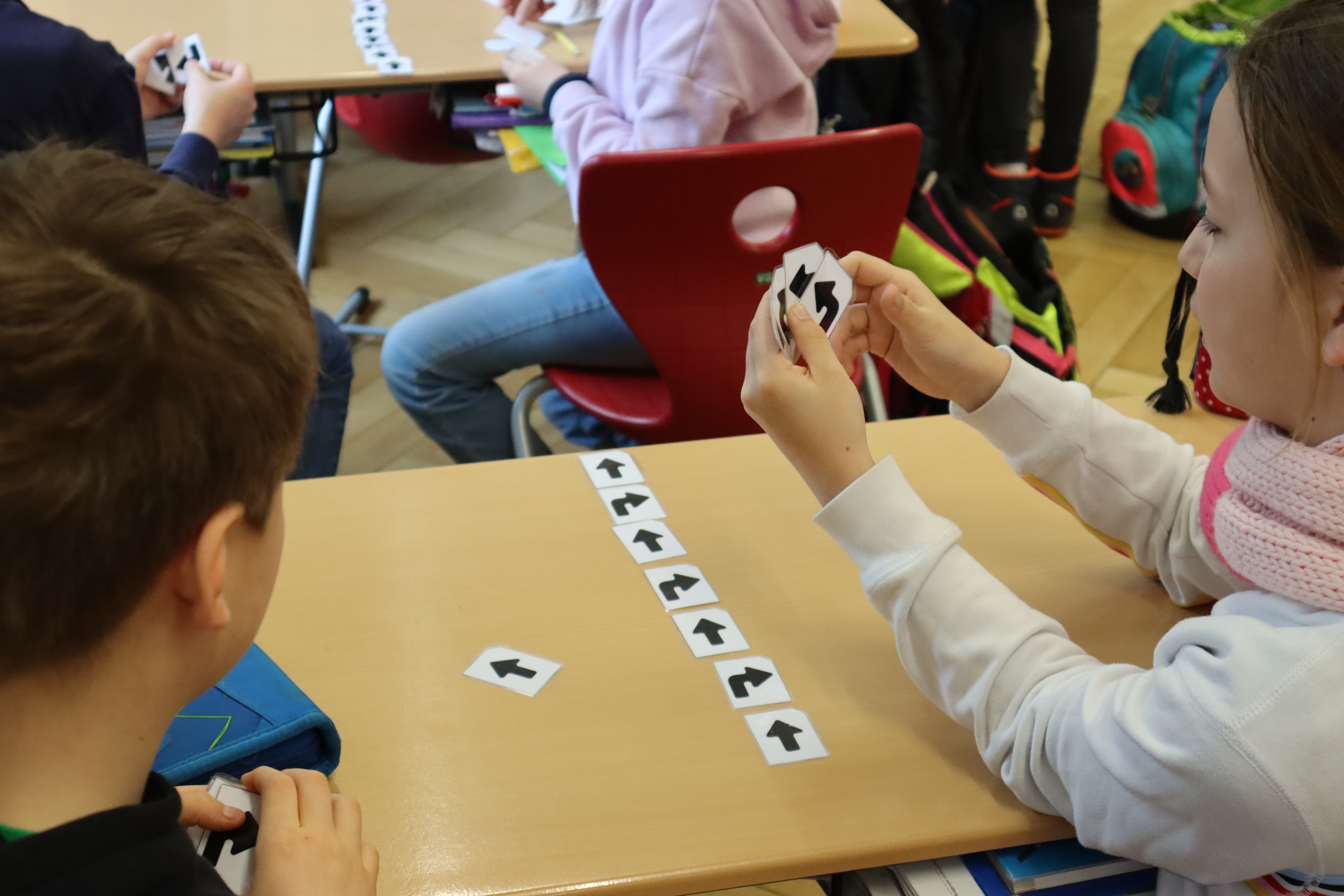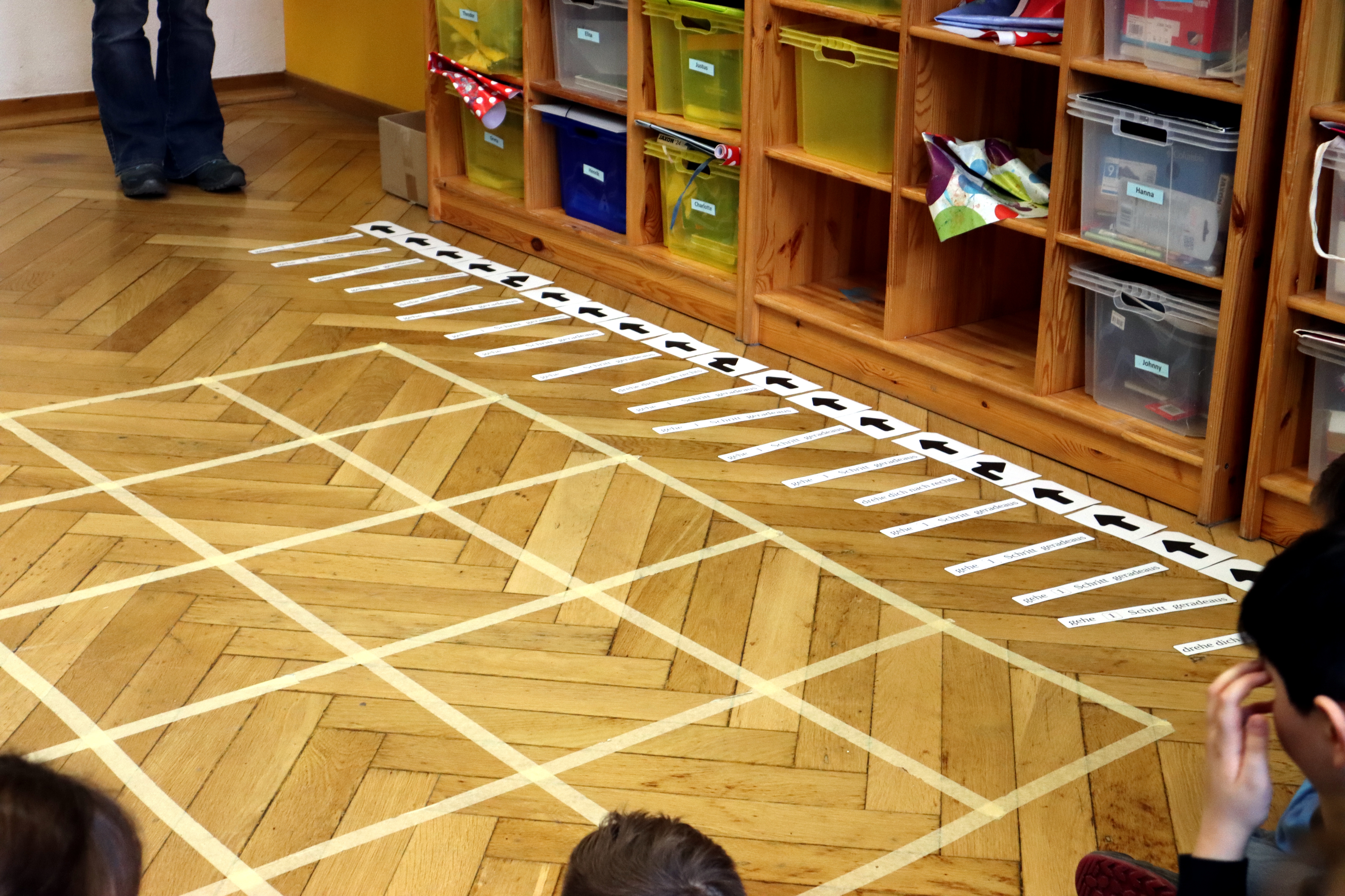 Die Kinder programmieren analog mit Folgen einfacher Anweisungen einen Roboter: die/den Mitschüler:in oder die Lehrkraft, die den Anweisungen des selbst geschriebenen Programms folgend durch einen Parcours geschickt wird. Hierzu zerlegen sie das Problem („vom Start zum Ziel“) in Teilschritte, lernen Schleifen und logische Abfragen (wenn – dann) kennen und schaffen so ihren ersten Algorithmus. Sie programmieren diesen als Abfolge von Befehlskarten, die dann vom „Roboter“ Schritt für Schritt befolgt werden.